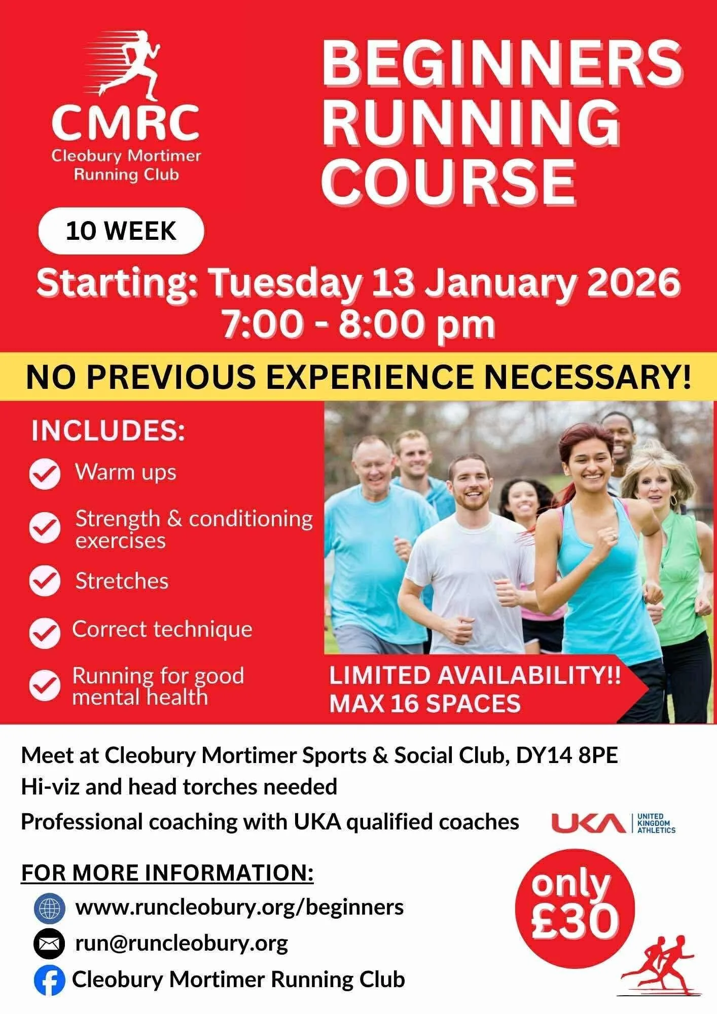You will be shown how to warm up properly, strength and conditioning exercises and correct post run stretches. The course will begin gently with intervals of walking and running which will increase safely each week so that you are running more and walking less as the weeks progress! You will also be given a schedule so that you can complete additional sessions in your own time.